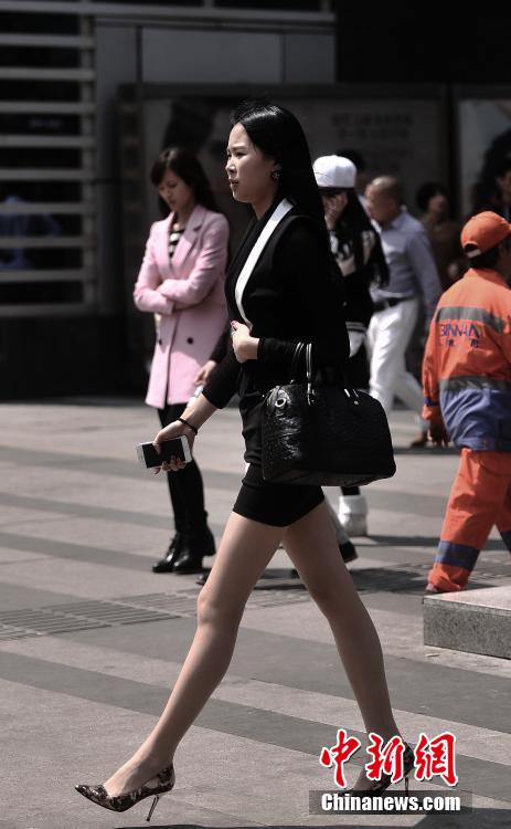 3月25日,重庆观音桥步行街上一美女身着短裙出行。天气预报显示,当日重庆主城最高气温已达到25℃。中新社发 陈超 摄