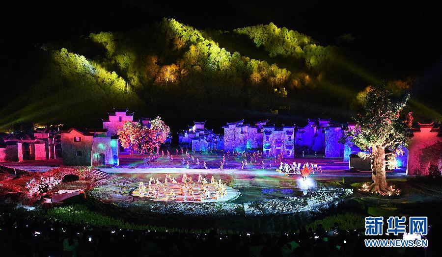 3月25日晚,大型山水实景演出《梦里老家》在“中国最美乡村”——江西婺源县预演,正式首演将于27日举行。据介绍,该剧分梅韵、枫韵、荷韵、蝶韵四幕,以一个常年在外的婺源游子思家的乡愁为主题,围绕婺源四季景色变化,融入婺源民俗文化精髓,以冬、秋、夏、春的顺序倒演,展示古徽州的商贾文化、书乡文化、茶文化、婚嫁文化、农耕文化以及历史名人文化。新华社记者宋振平摄