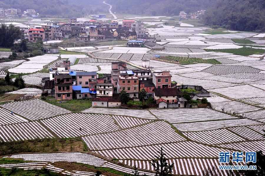 3月17日,广西罗城县天河镇北华村农民在田间劳作。春耕时节,广西罗城仫佬族自治县气温回升,雨水充足,当地农民抓住有利时机抢播抢种,广袤的田野如一幅美丽的画卷。 新华社发(吴耀荣 摄)