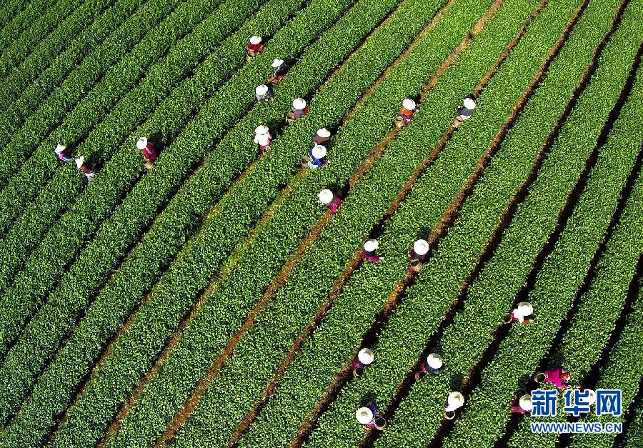 3月24日,采茶工人在杭州梅家坞村一茶园里采摘龙井茶(航拍器拍摄)。近日,西湖龙井茶新茶大规模开采上市。 新华社发(李建刚 摄)