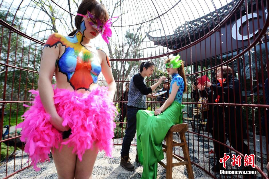 近日,一场以“孔雀”为主要元素的人体艺术“时装”秀在扬州一巨型鸟笼里进行。 中新社发 孟德龙 摄