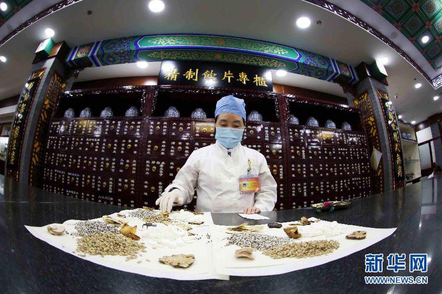 工作人员在位于大栅栏的北京同仁堂抓药(4月2日摄)。安宫牛黄丸、牛黄解毒片、乌鸡白凤丸、六味地黄丸……当人们提及这些家喻户晓、疗效显著的中医药品,多会想到同仁堂。从康熙年间的一家小药房,到供奉御药,再到今天扬名海内外的现代中医药集团,同仁堂经历了346年风雨。历代继承者们恪守着“炮制虽繁必不敢省人工,品味虽贵必不敢减物力”的祖训,在患者心中铸造了一块“金字招牌”。新华社记者 孟菁 摄