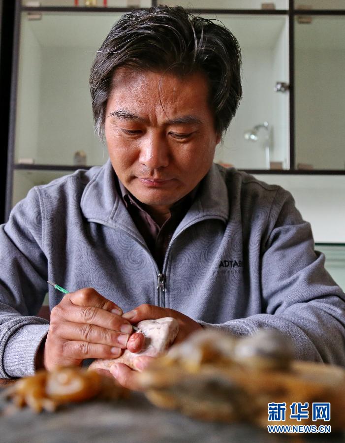 46岁的农民孟祥久家住河北省迁安市张官营村,他自幼酷爱绘画,耕作闲暇之余,做起了“俏色石雕”。他从村边的滦河滩上捡来各式各样的石头,利用石头本身的颜色、纹理,雕刻成蜗牛、蟾蜍、蝉等多种栩栩如生的艺术品,其作品受到收藏者的喜爱。新华社记者 杨世尧 摄