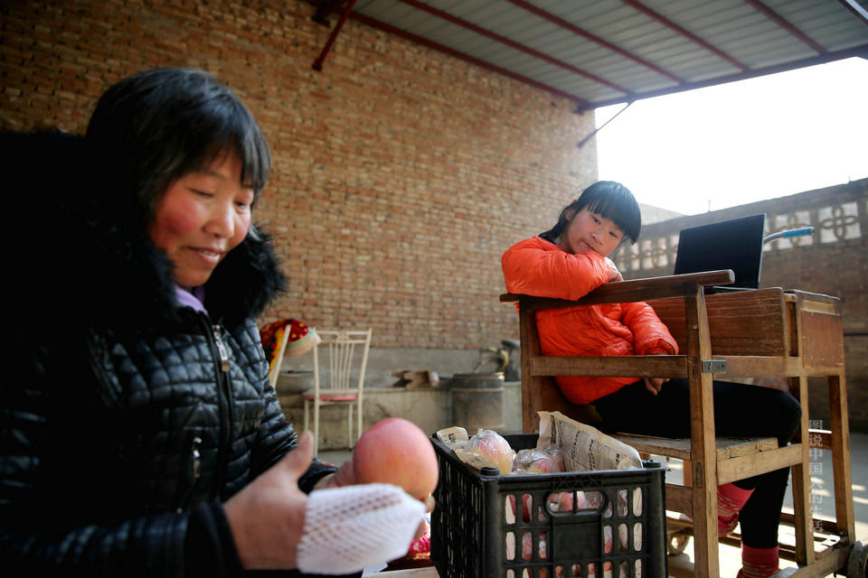 1991年,郭向鸽出生在山西运城临猗县的一个小村庄,不幸的是,她在出生时因脑部缺氧而导致脑瘫。郭向鸽的父亲是当地乡镇一名教师,母亲是一名普通的农村妇女。图为郭向鸽的母亲正在打包苹果。