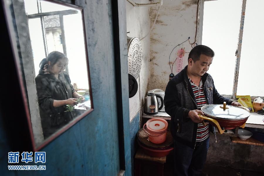 4月22日,刘春林(右)在家中帮助母亲黄群英做饭。