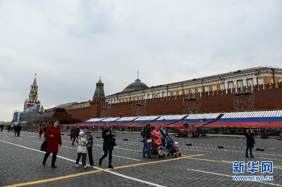 这是胜利日前夕的俄罗斯莫斯科红场(4月26日摄)。今年是世界反法西斯战争胜利70周年。俄罗斯将于5月9日“卫国战争胜利日”在莫斯科红场举行大规模阅兵庆典。近日,工作人员在红场忙碌,迎接胜利日庆典的到来。新华社记者贾宇辰摄