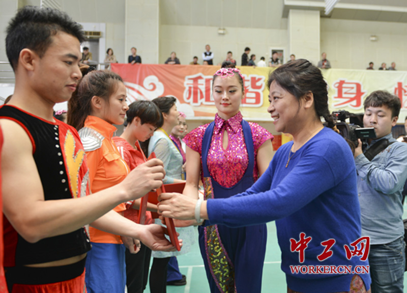 图为江西省总工会党组成员、副主席林玉华同志为全省职工核心价值观工间操大赛获奖单位颁奖。