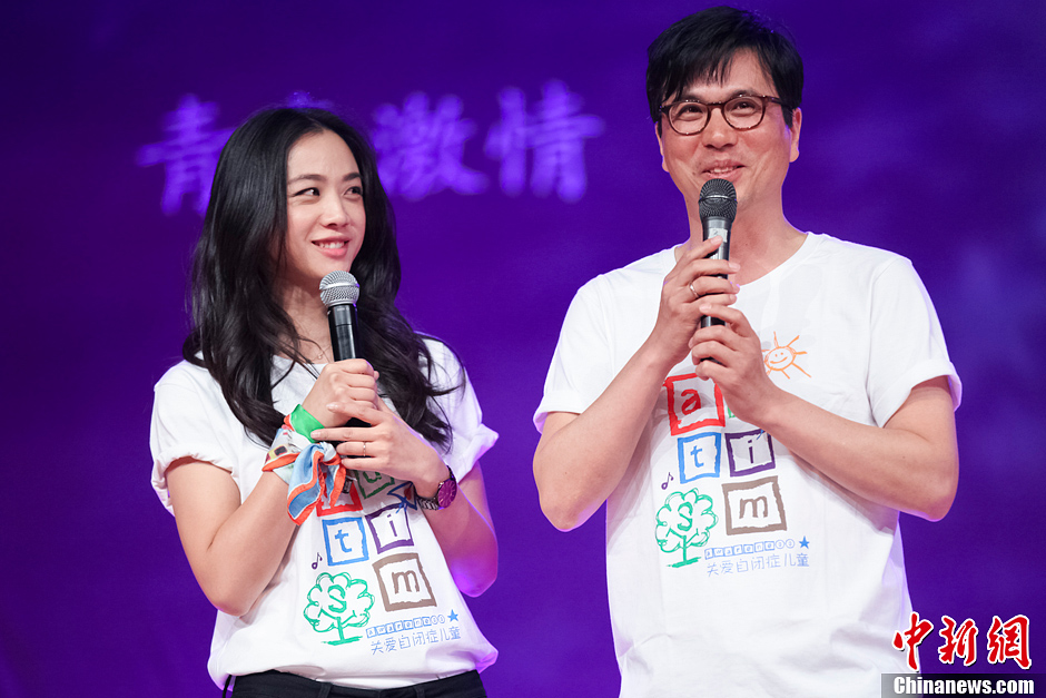 5月7日,第22届北京大学生电影节接近尾声,第16届大学生原创影片大赛在北京师范大学举行颁奖典礼。汤唯、金泰勇夫妇、导演张一白、薛晓璐亮相现场,为“关注自闭症儿童”公益主题征片单元颁奖。图为汤唯、金泰勇夫妇。中新社发 熊然 摄