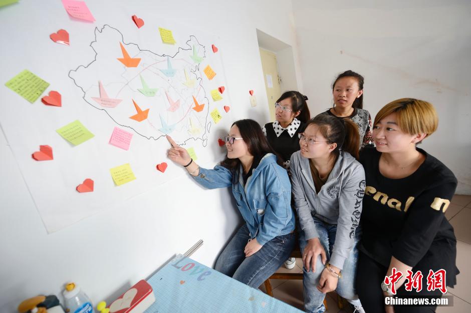 5月13日,学生们在自己的宿舍中,她们把各自毕业后打算去的城市用小船标在中国地图上。当日,记者探访了呼和浩特民族学院学生的宿舍生活,他们在这里度过各自的大学生活。中新社发 刘文华 摄