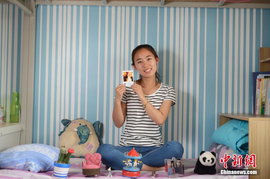 5月13日,学生在自己的床铺上,手拿与妈妈的合影,她很喜欢自己的妈妈,天天与妈妈微信聊天。当日,记者探访了呼和浩特民族学院学生的宿舍生活,他们在这里度过各自的大学生活。中新社发 刘文华 摄