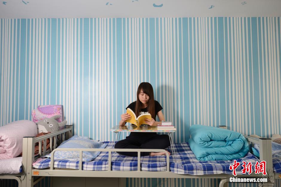 5月13日,学生在自己的床铺上,学习英语方向的小学教育专业,今年大一,在不大的床铺上,实用的折叠小桌很受学生欢迎。当日,记者探访了呼和浩特民族学院学生的宿舍生活,他们在这里度过各自的大学生活。中新社发 刘文华 摄
