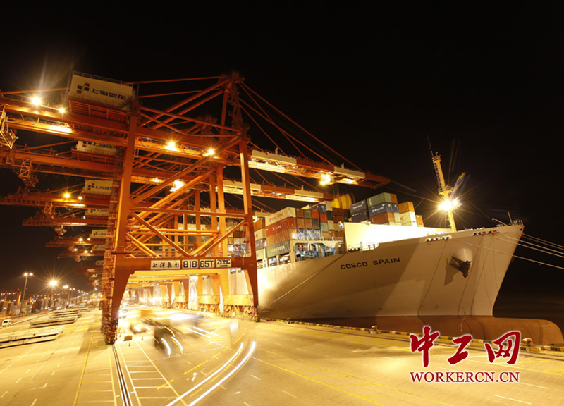 5月21日,中远西班牙轮停靠在上海洋山港。中工网记者韩靖摄。