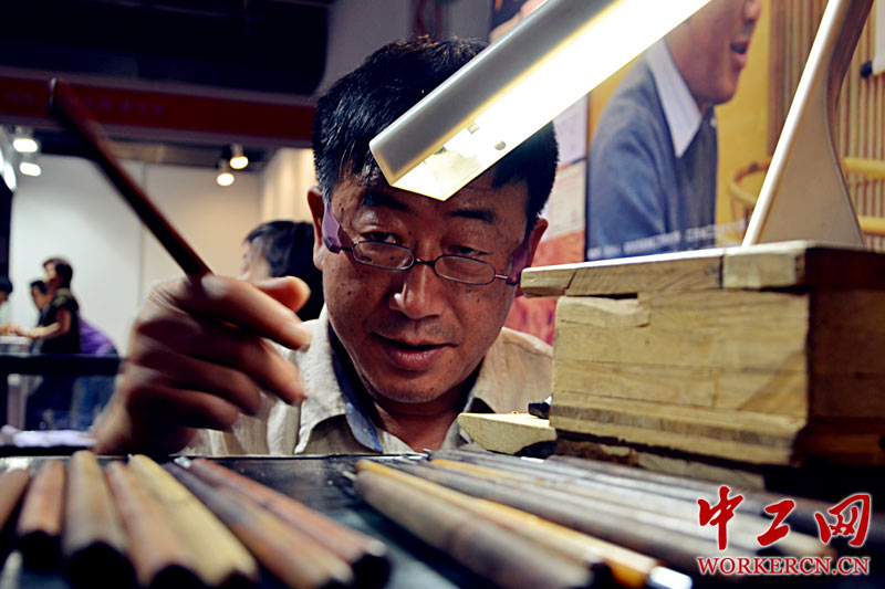 “我每天早上8点半开始工作,一般到晚上10点休息,几十年天天如此。我觉得拿刻刀是一种享受,三天不拿刀就像缺了什么一样,心里难受。就是参加展销会,也要带台灯、刀具,得空的时候刻几刀。”周建明说。