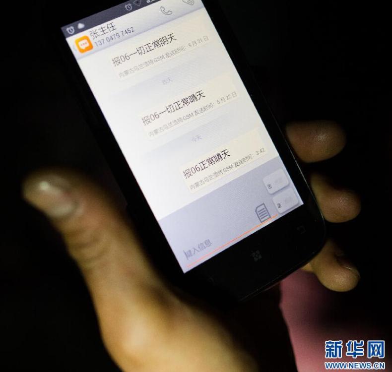 5月23日凌晨三点多,瞭望员王金龙在完成当日第一次瞭望后短信汇报。新华社记者 李任滋 摄 图片来源:新华网
