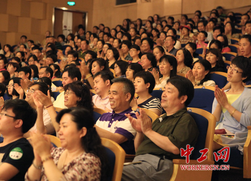 来自西城区教育系统的30多所学校近千名教职员工到场,在两个小时的交响音乐会上,不时响起教职工们长时间热烈的掌声。演出的主曲目包括交响诗《红旗颂》、《红色娘子军》组曲、钢琴协奏曲《黄河》和《黄河大合唱》等。(中工网记者杨灵 摄)