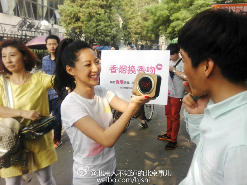北京街头现美女宣传禁烟,香烟换香吻。美女当街索吻,还给路人介绍吸一口烟的危害,网友称这是用行动支持北京最严禁烟令!