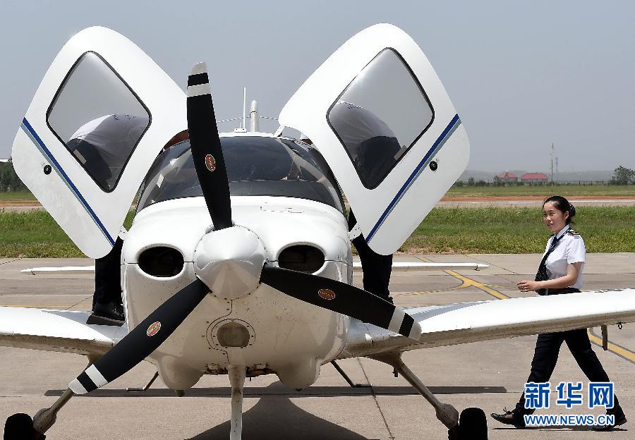 6月5日,女飞行大学生耿晨走向一架训练飞机,准备参加飞行训练。日前,在中国民航飞行学院洛阳分院,来自山东、江苏、湖北、四川等地的9名女飞行大学生,正在参加205个飞行训练小时的实践课程。飞行职业要求作风严谨,训练和日常生活管理都是“准军事化”,对这些女孩子来说,学习飞行是一次人生的磨练,有许多挑战,也有许多惊喜。据了解,2007年,中国民航第一批通过高考招收的女飞行员就是在中国民航飞行学院洛阳分院毕业的。此后每年都有一定数量的女飞行学生从这里走向工作岗位,实现了她们的蓝天梦想。新华社记者王颂摄