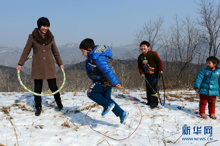 乡村老师孟敏和她仅有的3个学生在雪地上进行课外活动(2014年2月20日摄)。山东济南章丘市垛庄镇四角城村有300多口人,孟敏是四角城教学点唯一的老师,30年来,孟敏一直坚持做着一件了不起的事儿:教村里的孩子识字算数。她教过的学生已有300多人,已经快要超过村里目前的人口总数。孟敏说,即使只有一个孩子,她也要坚持教下去,但她更希望孩子们能有更好的学习环境。