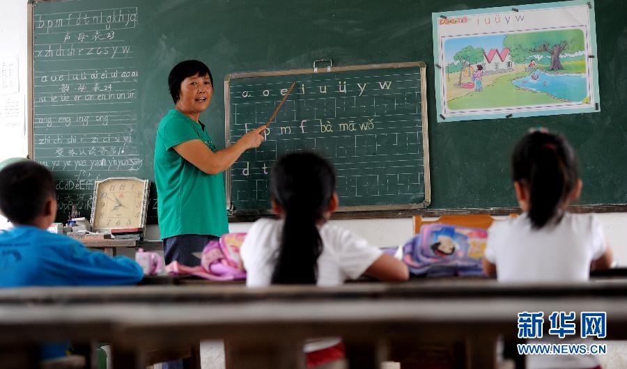 安徽省肥西县大丰小学的俞萍老师为学校里仅有的3名学生上课(2014年9月9日摄)。“这一届,学校只有3名学生。”对俞萍来说,这是她从教30年来面对的最少一届学生。大丰小学位于安徽省肥西县严店乡大丰村,10多年前学校共有6个年级,300多名学生。近些年,随着农村生源减少,再加上一些孩子跟随打工的父母进城读书,如今每年学校只能招收到几名学生。孩子们在这里读完一年级后便转学到离家更远的乡镇中心学校就读。但俞萍说:“为了孩子就近读书,希望学校不会被撤并。只要有一名学生,我就会坚持下去,为乡村孩子做好启蒙教育。” 新华社记者 刘军喜 摄