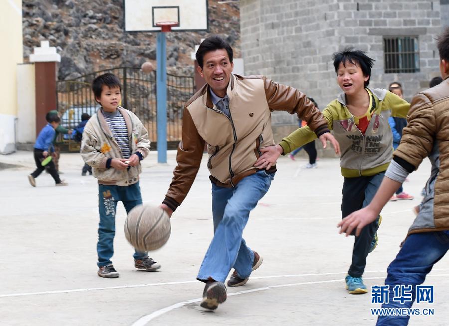 刘兴毅(左二)和学生们在课间打篮球(2015年1月7日摄)。今年47岁的刘兴毅是广西大化瑶族自治县板升乡弄勇小学的校长,24年来扎根大石山区从事教育事业。他是校长,是老师,也是250多名山里孩子的“家长”,他希望让更多的孩子通过知识走出大山。新华社记者 黄孝邦 摄