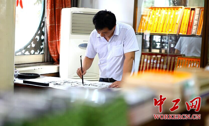 为了提高自己的制笔技术水平,王师傅专门学习了书法,他说“书法的水平我只能是业余,不能专,如果我擅长狼毫,我对狼毫的制作就有所偏爱,会影响其他类型毛笔的制作”。 图为王侯显师傅在练字,也是检验制作的毛笔的质量。 中工网记者 段瑜摄