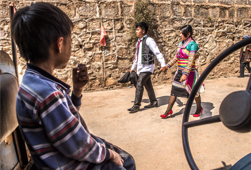 南伞乡新娘李江梅身着苗族服装,脚踏汉族高跟鞋与新郎偕手走进寨子 刘英毅摄