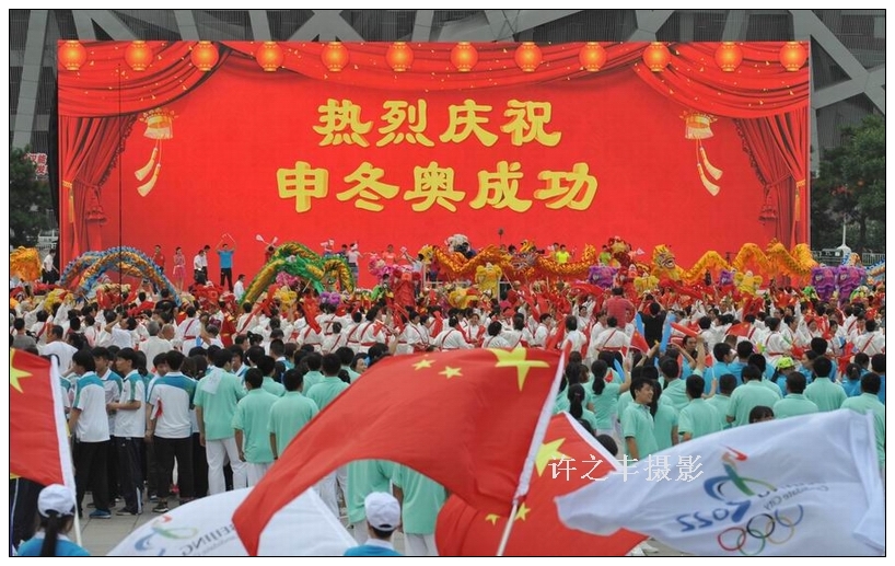 2015年7月31日,在马来西亚吉隆坡举行的国际奥委会第128次全会投票决定,北京成为2022冬奥会和冬残奥会举办城市。北京也成为全球唯一一座既举办过夏季奥运会、又将举办冬奥会的城市。图为北京市民热烈庆祝申冬奥成功。工人日报-中工网记者许之丰摄影报道