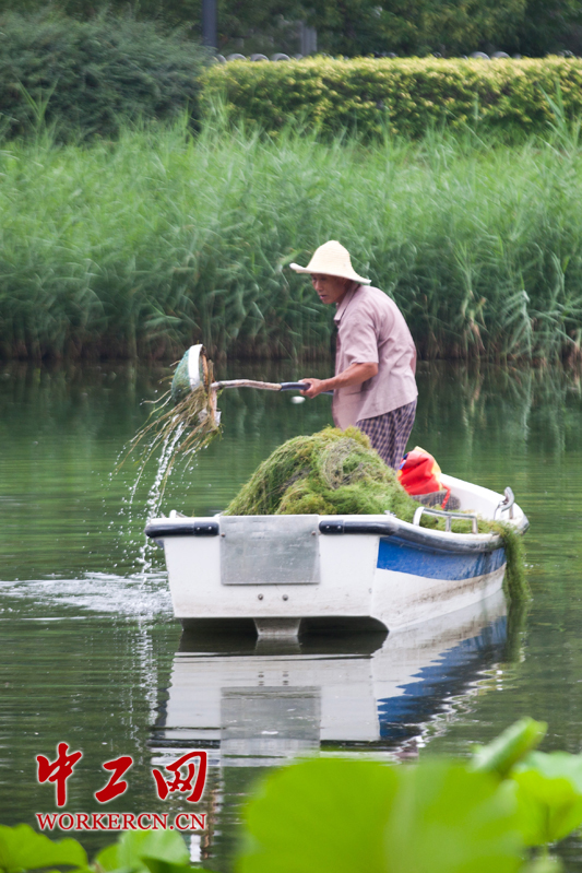 老李用网子捞草。