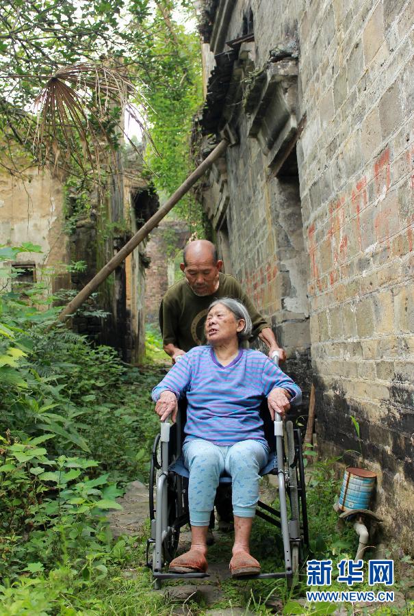 梁自宣用轮椅推着老伴散心(8月8日摄)。梁自宣出生于1928年1月,现住广西全州县石塘镇枫木村梁家屯。在70年前的抗日战场上,作为担架兵的他冒着枪林弹雨抢救战友。梁自宣的老伴今年82岁,10年前因中风下半身瘫痪,右手近乎瘫痪,右眼失明。10年来,梁自宣悉心照料老伴。“和战场的生离死别相比,这点困难不算什么,老伴照顾了我大半辈子,我要一直陪她走下去”,梁自宣说。新华社记者 唐荣桂 摄
