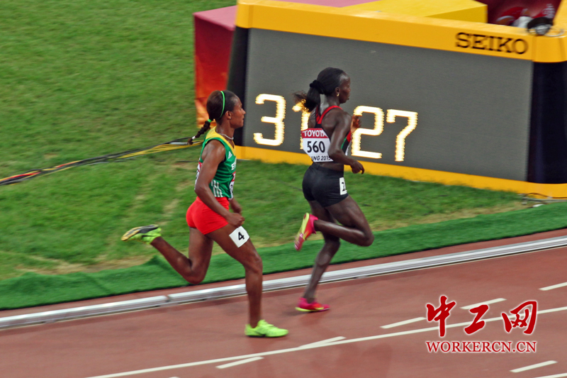 肯尼亚选手切鲁约特与埃塞俄比亚的伯卡最后100米的冲刺对决。 中工网 张起晨摄