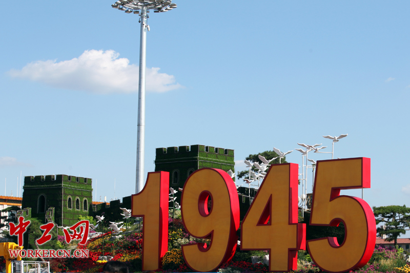 近日,为纪念抗战胜利70周年,北京市以“共同发展,面向未来”为主题在天安门广场、长安街沿线等重点区域布置花卉。目前布置工作已基本完成,在9月1日左右,将会拆除周围护栏,花卉摆放时间将延续到10月底。市民和游客可欣赏到总占地3000平方米的“长城”主题花坛,以及人民英雄纪念碑周边的桧柏花带。此外,广场内东西两块绿地也可欣赏到花柱、花球、花带等环境景观。(图为26日拍摄)。 中工网 张起晨摄