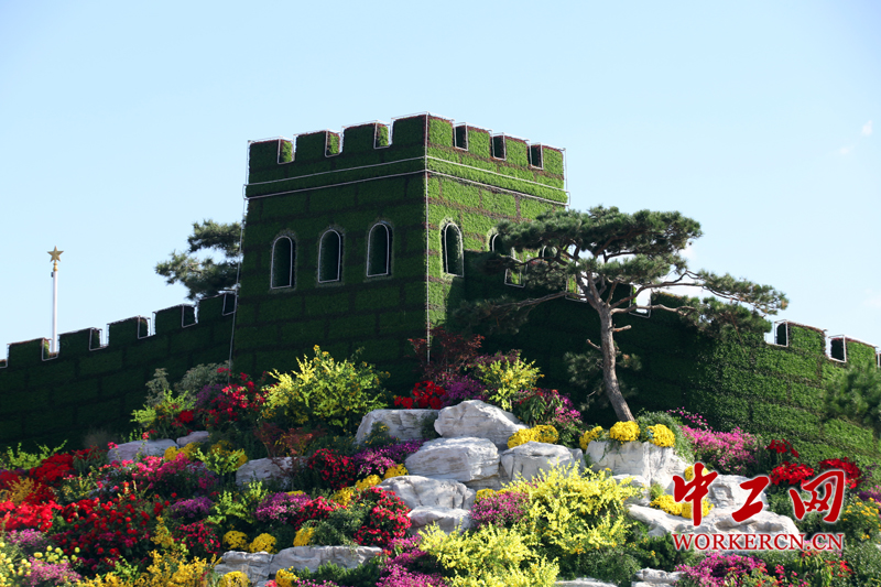近日,为纪念抗战胜利70周年,北京市以“共同发展,面向未来”为主题在天安门广场、长安街沿线等重点区域布置花卉。目前布置工作已基本完成,在9月1日左右,将会拆除周围护栏,花卉摆放时间将延续到10月底。市民和游客可欣赏到总占地3000平方米的“长城”主题花坛,以及人民英雄纪念碑周边的桧柏花带。此外,广场内东西两块绿地也可欣赏到花柱、花球、花带等环境景观。(图为26日拍摄)。   中工网  张起晨摄