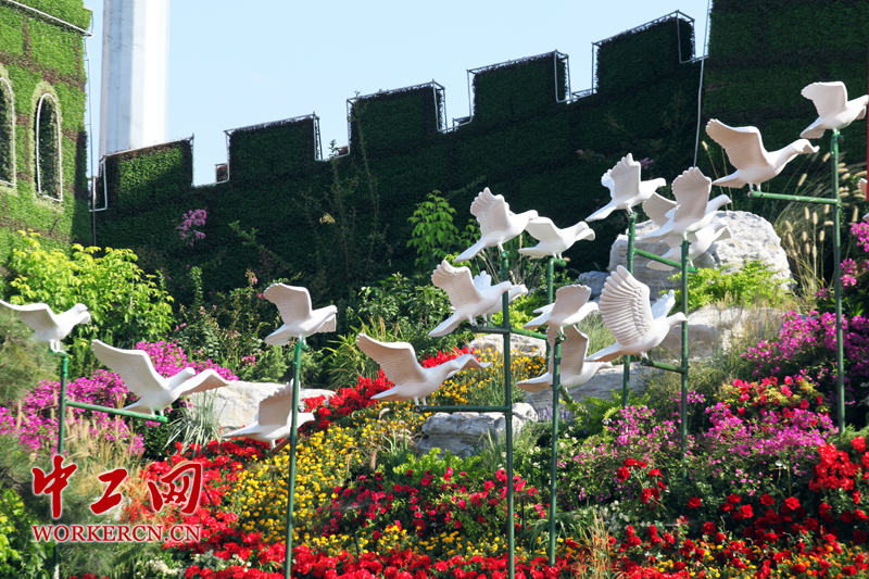 近日,为纪念抗战胜利70周年,北京市以“共同发展,面向未来”为主题在天安门广场、长安街沿线等重点区域布置花卉。目前布置工作已基本完成,在9月1日左右,将会拆除周围护栏,花卉摆放时间将延续到10月底。市民和游客可欣赏到总占地3000平方米的“长城”主题花坛,以及人民英雄纪念碑周边的桧柏花带。此外,广场内东西两块绿地也可欣赏到花柱、花球、花带等环境景观。(图为26日拍摄)。 中工网 张起晨摄