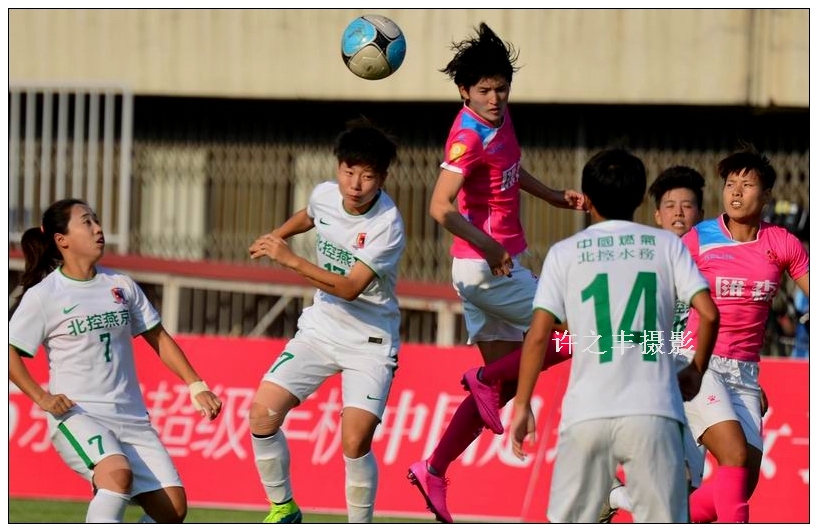2015年9月6日下午,在北京先农坛体育场举行的中国足协女子超级联赛北京赛区的比赛中,北京队经过90分钟的苦战以3比2战胜了天津队, 图为双方的拼抢。