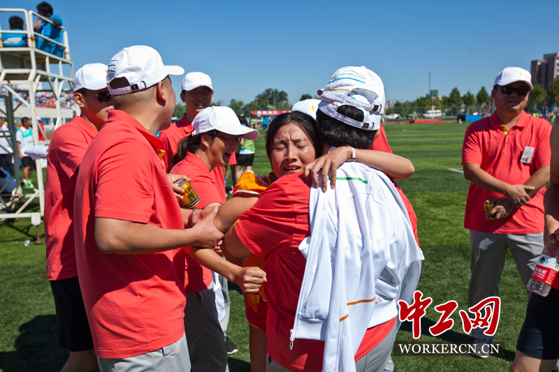 图为中建一局北京公司一名女队员参加短跑比赛后,疲惫和激动让她和队友紧紧抱在一起。 中工网记者 李雪峰 摄