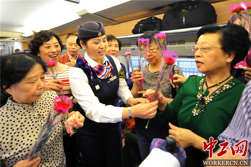 南昌客运段动车一队D2236次南动九、十组张映红为老年旅客每人送上一支康乃馨祝福节日愉快。