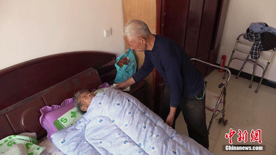 徐桂英的三儿子、62岁的刘天智正在照顾母亲起床。目前,徐桂英由三个儿子轮流照顾,每天晚上,儿子都会替老母亲暖被窝。刘天智说,老娘就是家里的宝,每天回家自己叫一声娘还有人答应,就觉得无比幸福。 韩章云 摄