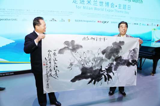 随后,老庄又即兴画了一幅“一泉流出江南夏,今朝还开大唐花”的水墨野荷,赠送米兰世博会中国国家馆收藏。