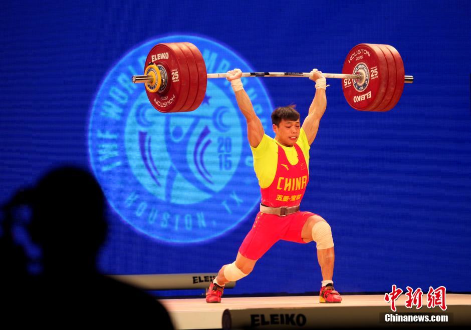 当地时间11月22日,2015世界举重锦标赛在美国休斯敦展开第二个金牌日的争夺,中国年轻选手谌利军在男子62公斤级比赛中一举打破挺举和总成绩两项世界纪录斩获两枚金牌和抓举一枚银牌,完胜卫冕冠军朝鲜选手金恩国。图为谌利军挺举最后一把成功举起183公斤,打破前辈乐茂盛2002年创造的182公斤挺举世界纪录,总成绩333公斤也将金恩国保持的世界纪录提高了1公斤。 中新社记者 王欢 摄