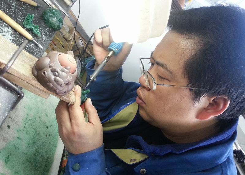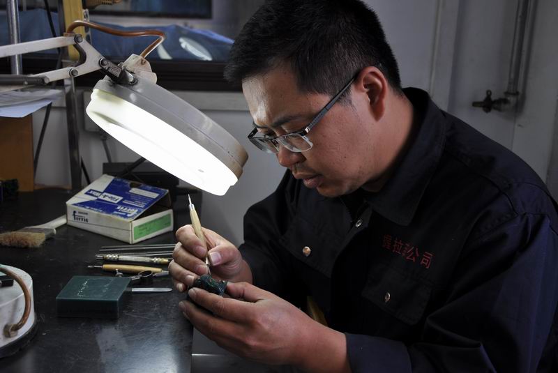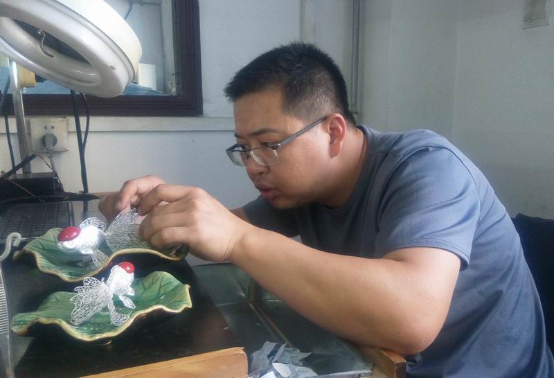 回想当年刚入厂时,师傅曾让他练习基本功,枯燥的动作,他重复了一年。当他有些灰心时,是母亲的话让他坚持了下来。母亲教导他,做事情要坚持,不要半途而废,如果遇到困难就往回退,那就什么都做不好。母亲很支持他的工作,不管多晚回家,也会等着。家的温暖,是鼓舞,更是一种激励。多年来他创作了大量体现中国传统文化的作品,“神武辟邪”、“金枝玉叶”、“龙凤爵杯”等多种贵金属工艺摆件作品,形态各异,栩栩如生,将金属的质感融入到作品中,充分表现出工艺美术精湛的制作技艺。“神武辟邪”荣获了第六届中国礼品大赛“华礼奖”优秀奖。不断拓展创新思路,引领高端路线。以高端大气为主旨制作的“锦绣良缘-英雄合卺杯”,在原有器物造型上进行新的改进,使整个摆件看上去浑然一体,气势磅礴,为企业走出了一条自主研发的创新之路。潜心追求22年他努力超越自我 从事贵金属首饰手工制作不仅要求技术全面,还要有一定的美术专业知识,才能深层次感知其中的寓意和结构上的搭配,使制作出的作品更加完美。他利用业余时间自学美术知识,阅读大量的工艺美术书籍,丰富了自己的文化知识。虽然已经是国家高级工艺美术技师,但他对自己还是有些不满意,他觉得要干好工艺美术这行还应该懂绘画。说道这里,他十分感谢爱人给予的帮助和支持。他的爱人从小学过绘画,有一定功底,教他一些基础知识。现在有时间就和爱人一起出去写生、练素描。可是,这双做工艺品雕刻、錾刻灵巧的双手,拿起画笔就显得笨拙了。为了尽快提高技巧,他已经拜师在学习绘画,有一天,他一定会拿出一个像样的绘画作品,就像练挫平、做錾刻那样,他就是要超越自己,追求极致。勇于挑战,破解技术难关。