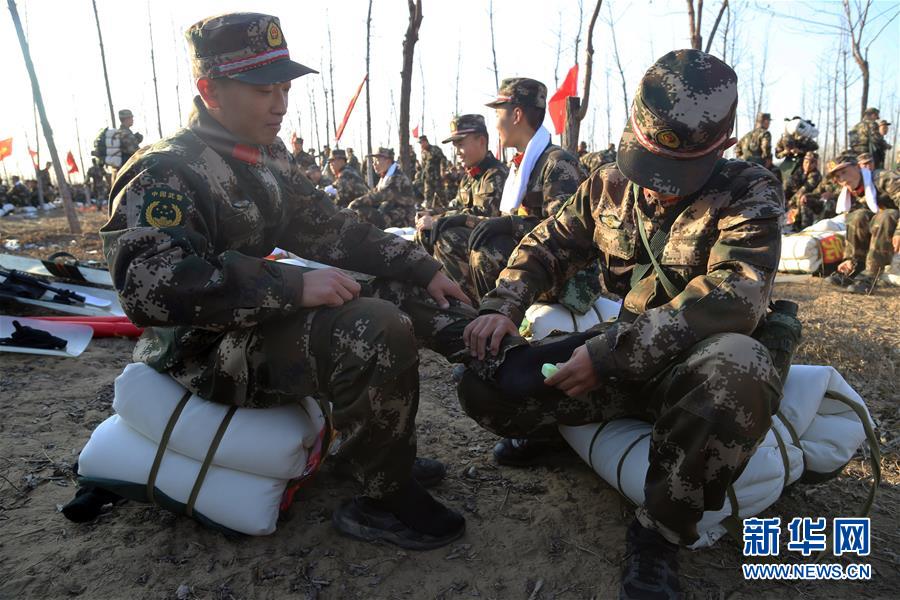 12月3日,武警北京总队七支队新训大队组织新兵徒步行军拉练,这是在拉练途中新兵班长(右)为新兵在脚底打肥皂,防止长时间行走脚底起泡。当日,武警北京总队七支队新训大队组织600余名新兵野营拉练。据了解,本次拉练行程约100公里,历时两天,这些“95后”新战士将全程背负约15公斤的行囊,完成紧急避险、战地救护、体能训练等10个科目的训练。新华社发(姜润邈 摄)