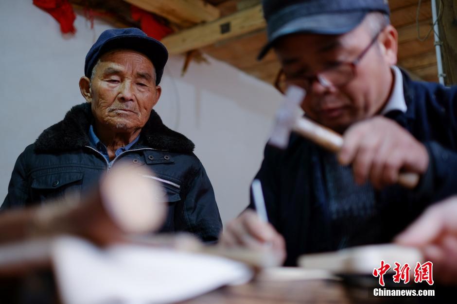 杨通杰老人在雕花环节时,严格把关。一把小小的苗族木梳制作技艺在杨家得以传承,并在传承中不断创新。 中新社记者 贺俊怡 摄