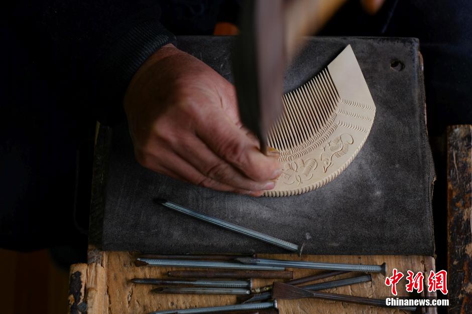 苗族木梳过去都是纯手工制作,一个熟练的师傅一天只能生产五、六把木梳,如今已引进机械生产,但是雕花、着漆等工序仍是人工完成。 中新社记者 贺俊怡 摄