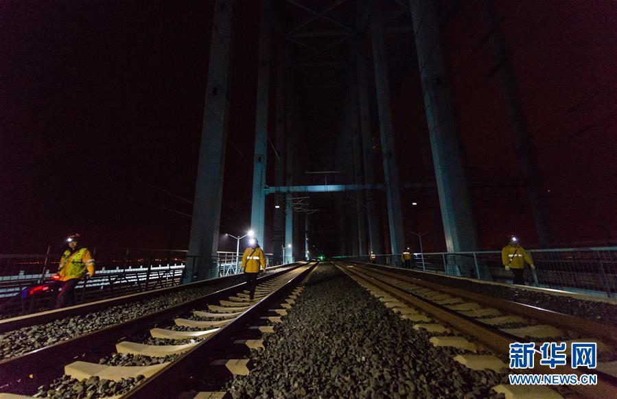 1月20日,桥隧工在江苏南京大胜关长江大桥上行走。当日零点到凌晨四点,京沪高铁第一桥——南京大胜关长江大桥迎来了春运前的最后一次大检。负责大胜关大桥检查维护的“守关人”,是上海铁路局南京桥工段大胜关桥梁车间的桥隧工们。深夜,当所有列车都通过后,桥隧工们开始工作。为了检查梁体附属,工人们爬上离地40多米的检查小车,以确保无可能掉落物体;为了检查、更换高强度螺栓,他们爬到桥面二十多米下方的墩台面,而像这样的螺栓大桥上共有约382万个,一旦发现有断裂丢失,需立马标记、记录、上报,以待修补……带着手电筒,穿着反光服,“守关人”把大桥上下走了一遍又一遍;冬夜里的一壶热水、一根烟,就是他们仅有的御寒武器。在上海铁路局南京桥工段工段,还有很多这样的桥隧工。他们日夜工作,保障着辖区内239座铁路桥的安全。 新华社记者 李响 摄
