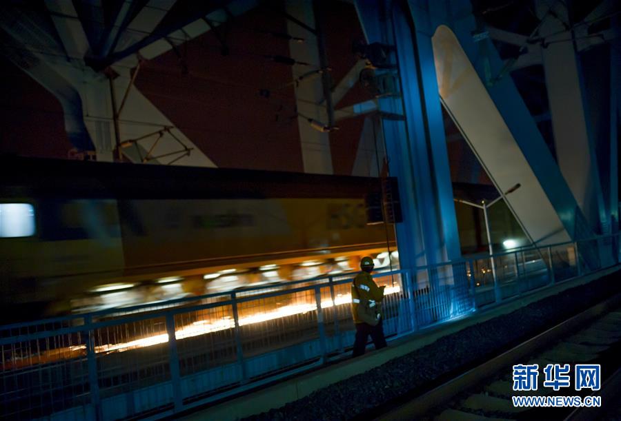 1月20日,在江苏南京大胜关长江大桥上,一名桥隧工从一辆行进中的钢轨打磨车旁走过。当日零点到凌晨四点,京沪高铁第一桥——南京大胜关长江大桥迎来了春运前的最后一次大检。负责大胜关大桥检查维护的“守关人”,是上海铁路局南京桥工段大胜关桥梁车间的桥隧工们。深夜,当所有列车都通过后,桥隧工们开始工作。为了检查梁体附属,工人们爬上离地40多米的检查小车,以确保无可能掉落物体;为了检查、更换高强度螺栓,他们爬到桥面二十多米下方的墩台面,而像这样的螺栓大桥上共有约382万个,一旦发现有断裂丢失,需立马标记、记录、上报,以待修补……带着手电筒,穿着反光服,“守关人”把大桥上下走了一遍又一遍;冬夜里的一壶热水、一根烟,就是他们仅有的御寒武器。在上海铁路局南京桥工段工段,还有很多这样的桥隧工。他们日夜工作,保障着辖区内239座铁路桥的安全。 新华社记者 李任滋 摄