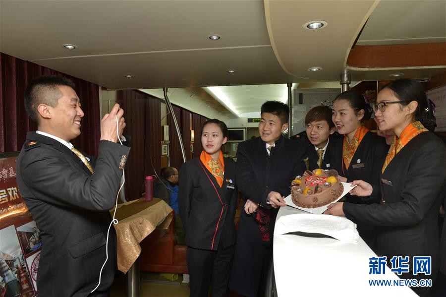 1月23日是秦梅的生日,同事们在车上为她庆祝(1月23日摄)。今年24岁的秦梅是兰州铁路局银川客运段北京车队的一名列车员,作为刚入职的新人,在经过了专业的培训之后,她第一次走上了春运乘务服务的一线。秦梅告诉记者,虽然在培训的时候她对繁重的乘务工作有了心理准备,但真正进入岗位开始工作后,才发现这份工作的不易。秦梅所在的车队每次出车要连续四个昼夜,每次当班她都要在狭长的车厢里来回走动6个小时以上,为旅客们换票、添水,清扫车厢。随着春运开始,客流量增大,列车员的工作愈发繁重,但秦梅却很乐观,“乘务工作就是需要细心和奉献,今年的春运是我的首秀,我一定会把服务做到最好!” 在兰州铁路局银川客运段,今年有近600位像秦梅这样刚入职的“90后”列车乘务员,他们将默默地勤奋工作在春运第一线。虽然乘务员们每天都很辛苦很累,不过只要走上岗位,他们总会把微笑和最好的状态展现出来,用热情周道细致的服务守护着千万人快乐幸福的“回家路”。新华社记者 彭昭之 摄