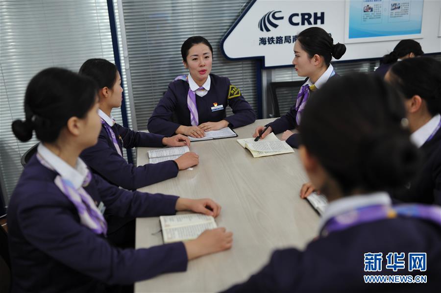 1月19日,在南京南站宁杭高铁车队工作区,列车长张海燕(左三)给列车员开班前会。 2016春运大幕已经开启。近日,记者走进上海铁路局南京客运段宁杭高铁车队工作区、生活区进行探访,用镜头记录“高姐”的幕后工作生活。新华社记者 李任滋 摄