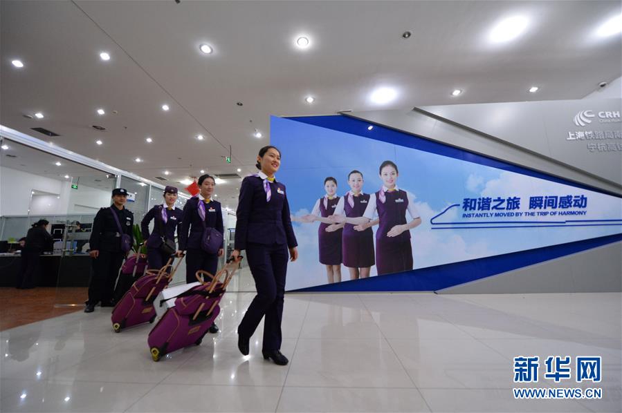 1月24日晚上九点多,南京南站宁杭高铁车队工作区,“高姐”们拖着行李箱前往公寓,准备第二天一早出车。 2016春运大幕已经开启。近日,记者走进上海铁路局南京客运段宁杭高铁车队工作区、生活区进行探访,用镜头记录“高姐”的幕后工作生活。新华社记者 李响 摄