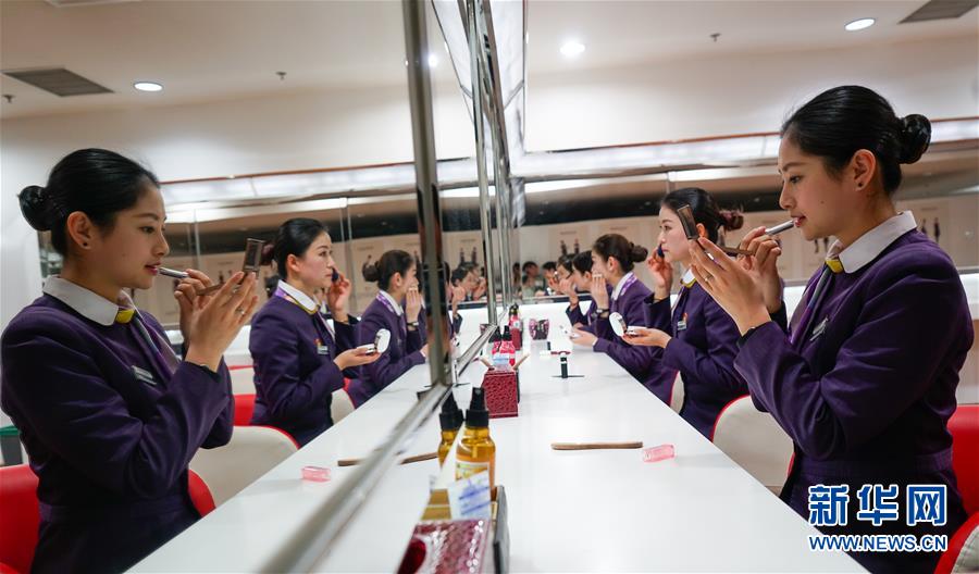 1月19日,在南京南站宁杭高铁车队生活区,“高姐”们在化妆。 2016春运大幕已经开启。近日,记者走进上海铁路局南京客运段宁杭高铁车队工作区、生活区进行探访,用镜头记录“高姐”的幕后工作生活。新华社记者 李响 摄