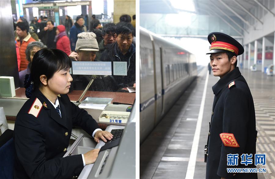 左图:南京火车站售票员张家琳在为旅客服务;右图:张家琳的丈夫、南京火车站助理值班员王超在列车发车后立岗送车(拼版照片,1月28日摄)。